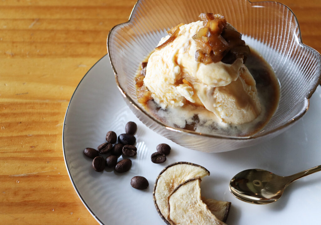 ほろ苦いコーヒーに和梨の甘さが移り、和梨にはコーヒーの香りと苦さが重なって、バニライスがグッと大人の味わいになります。和梨のドライはシャリシャリした歯応えが残っていてバニラアイスのいいアクセントに。アフォガードらしく、熱々コーヒーをかけてももちろん美味しいのですが、人肌に冷ますことでアイスクリームが溶けるまでの時間をゆっくり楽しみ、また、梨の甘さがコーヒーに染み出す時間と、梨にコーヒーが染み込む時間を稼いでみました。梨の甘さは後味が爽やかで、甘いものが苦手な人には特におすすめしたいデザートです。ぜひぜひお試しくださいね♪