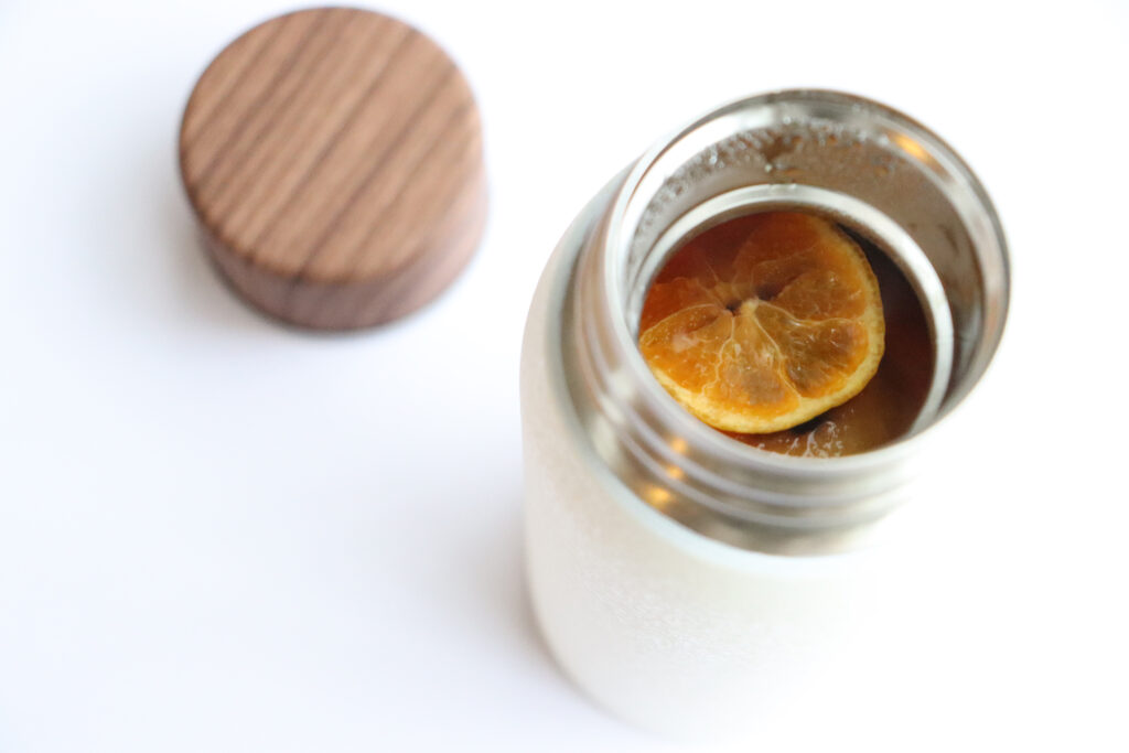 朝、ドライフルーツとお湯をマイボトルに入れておくと、時間とともに味わいが少しずつ変化していきます。半日ほどかけてゆっくり抽出すると、果物の甘みや香りがしっかりと広がり、より濃いフルーツティーになります。